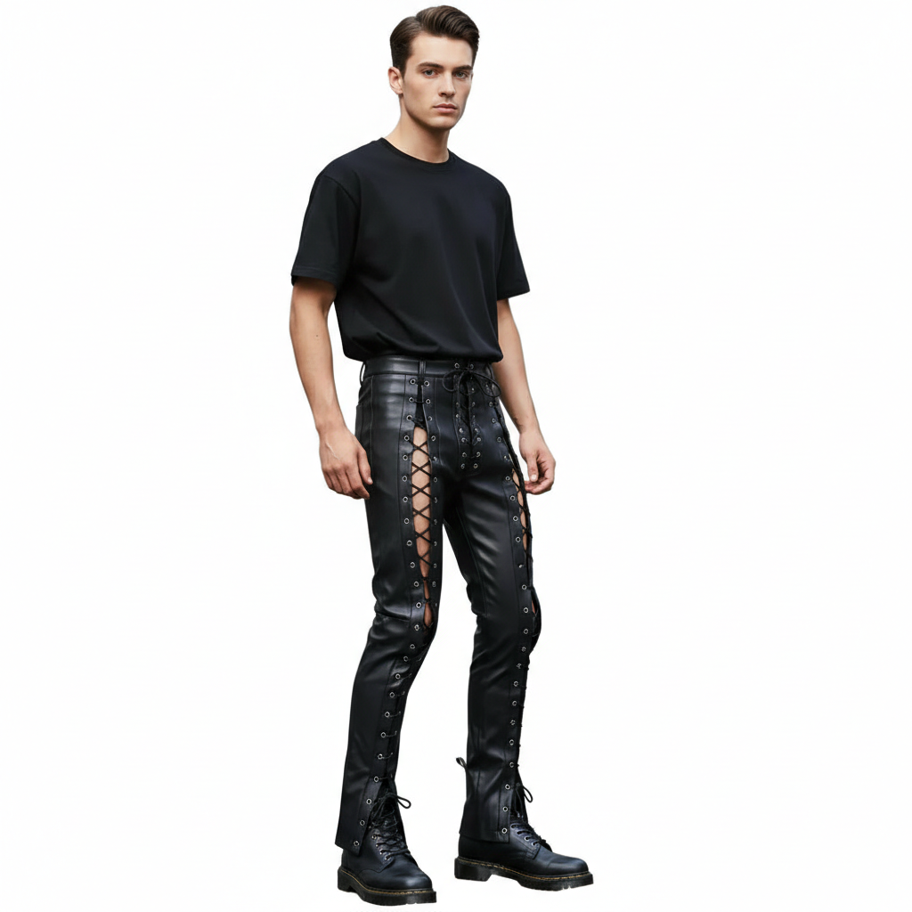 Men’s Slim Fit Cow Leather Pants with Lace‑Up Front Panels