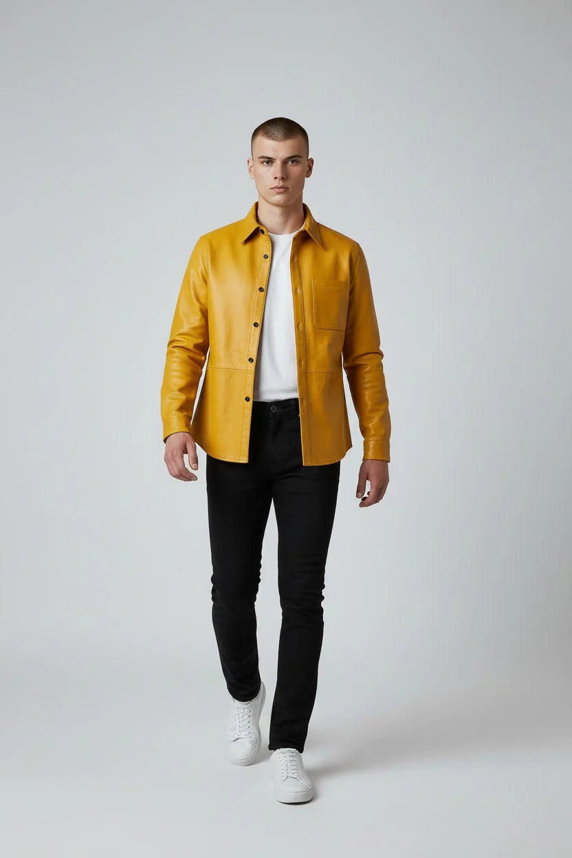This bold yellow leather shirt delivers a powerful fashion statement. Perfect for clubwear, parties, biker events, concerts, or standout street style. The full sleeves and structured fit provide a sleek masculine silhouette.