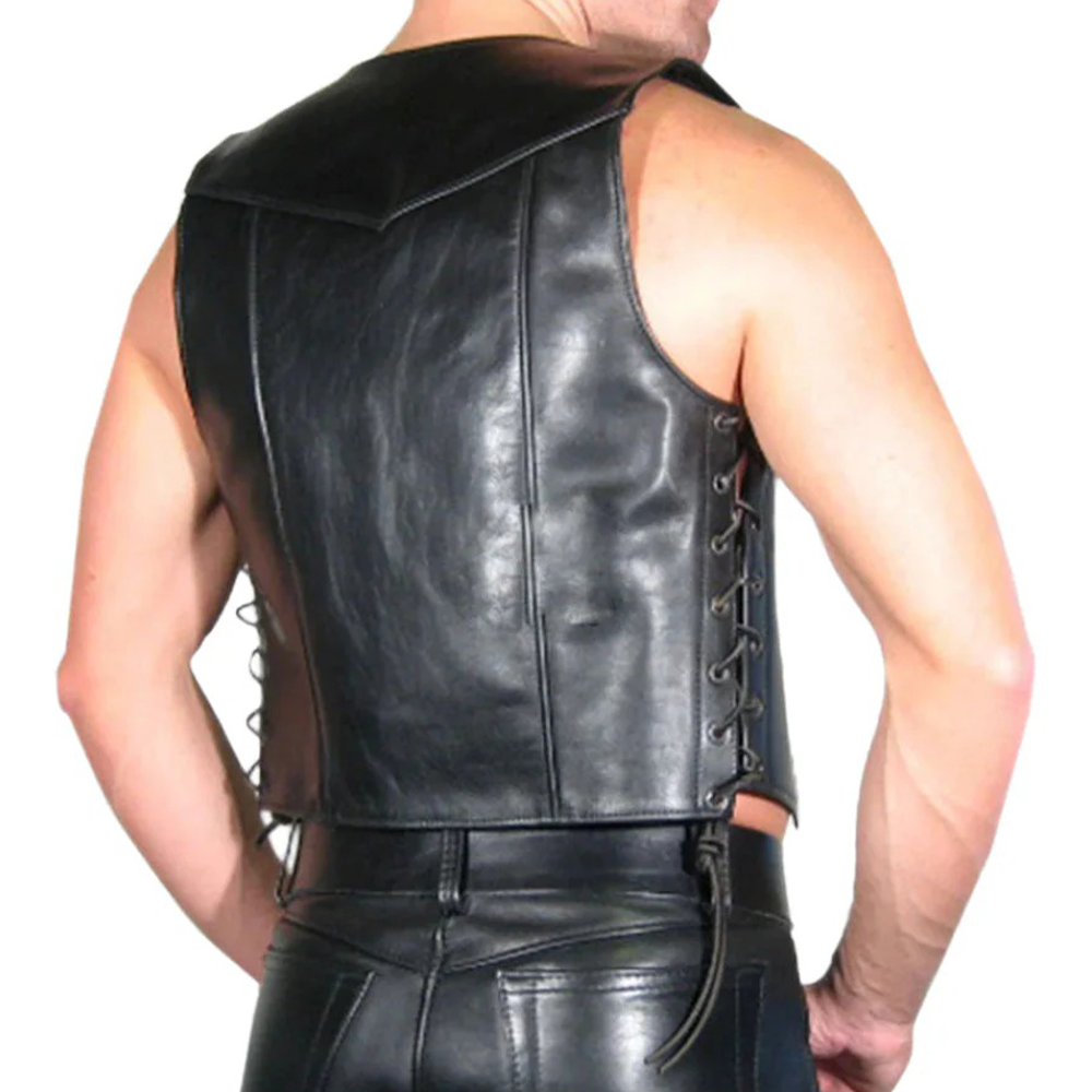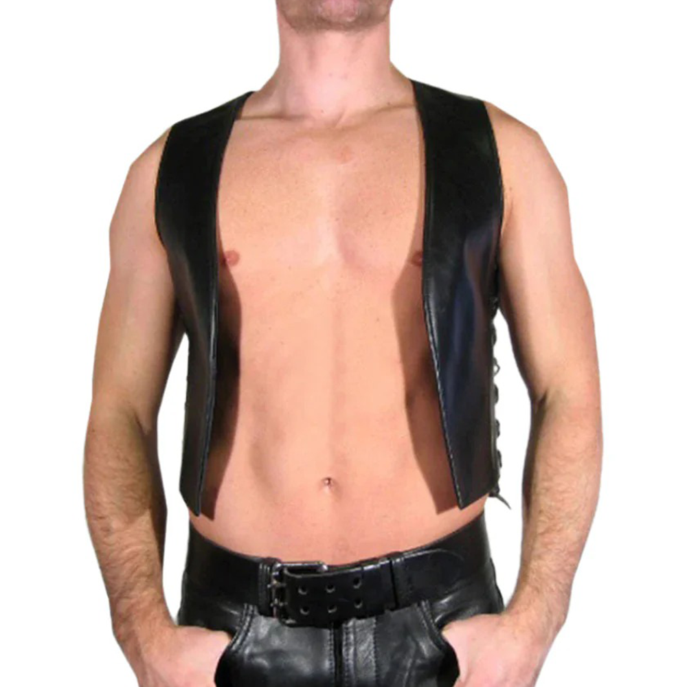 Men’s Cowhide Leather Bartender Vest – Side Lace-Up Fetish Clubwear