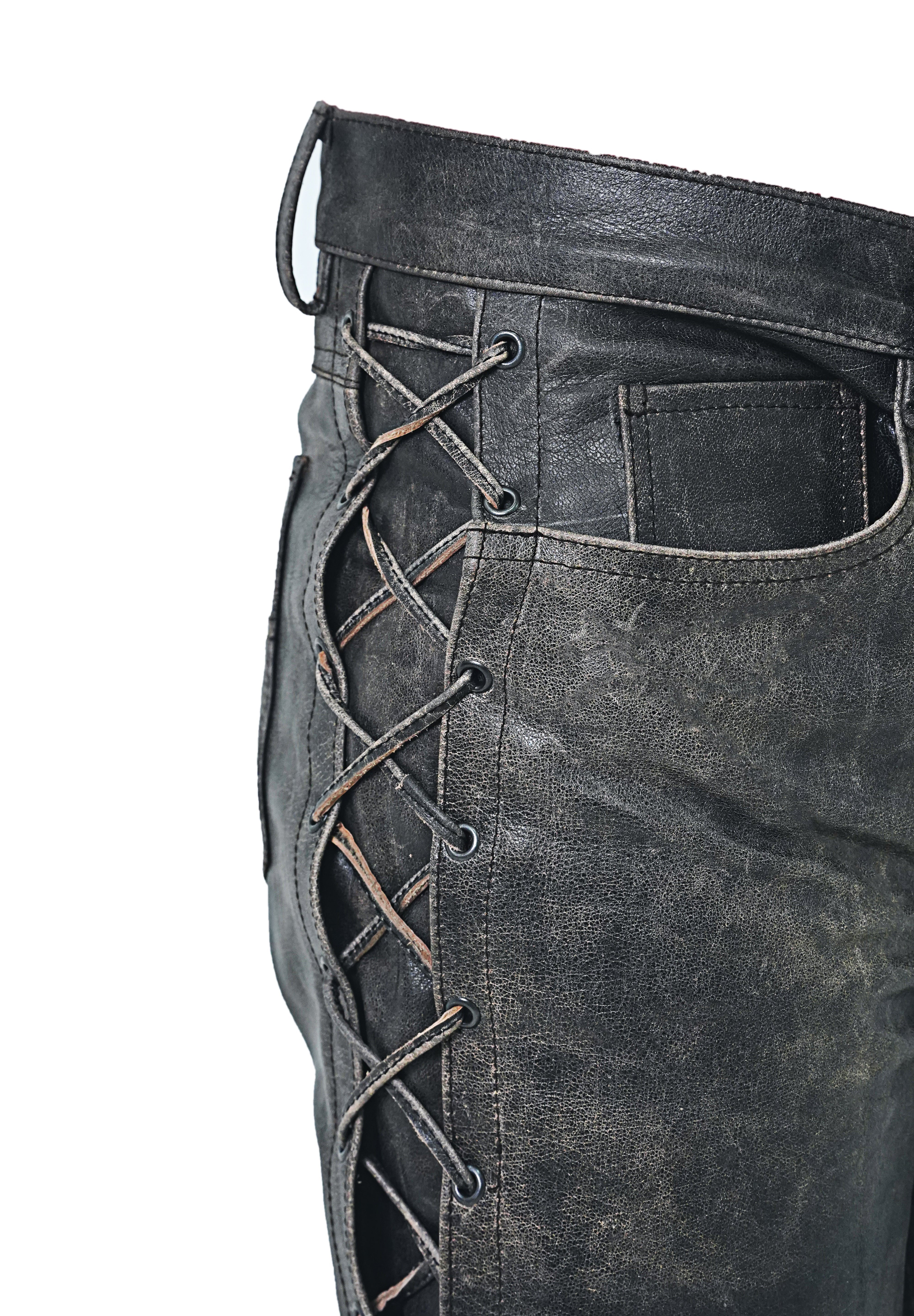 Men's Distressed Cowhide Leather Lace-Up Biker Pants