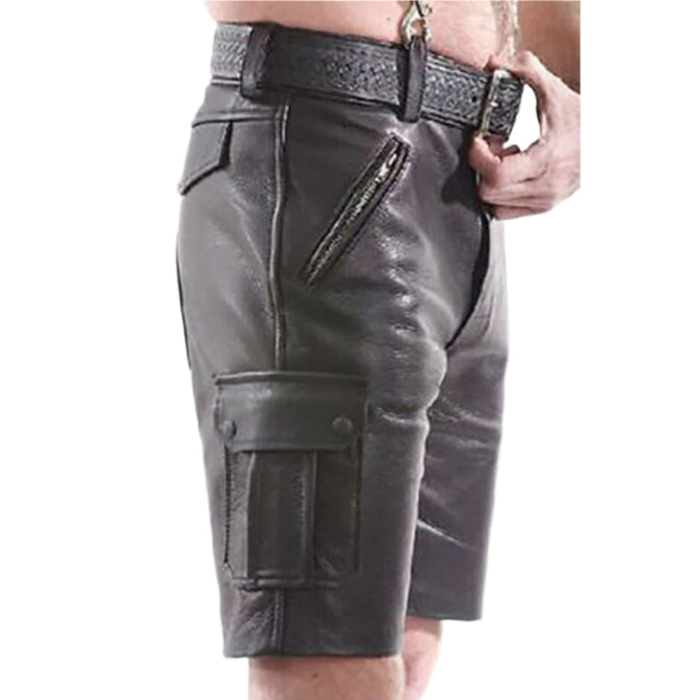 Men’s Cowhide Leather Cargo Shorts with Multi-Pockets