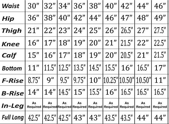 | Size | Chest (inches) | Waist (inches) | Hip (inches) | Inseam (inches) |