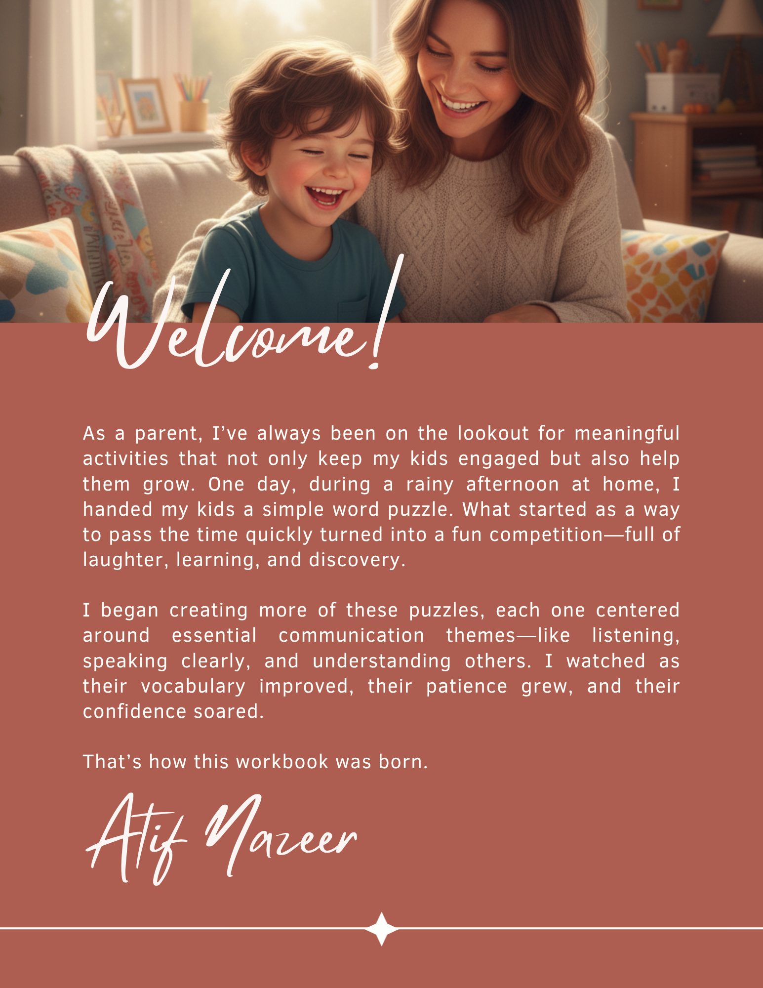 Make learning words and communication fun again! This engaging, screen-free workbook is packed with creative word puzzles designed to help kids speak, listen, and connect better—all while having fun. Created by a parent, for parents who want meaningful, hands-on learning without more screen time.