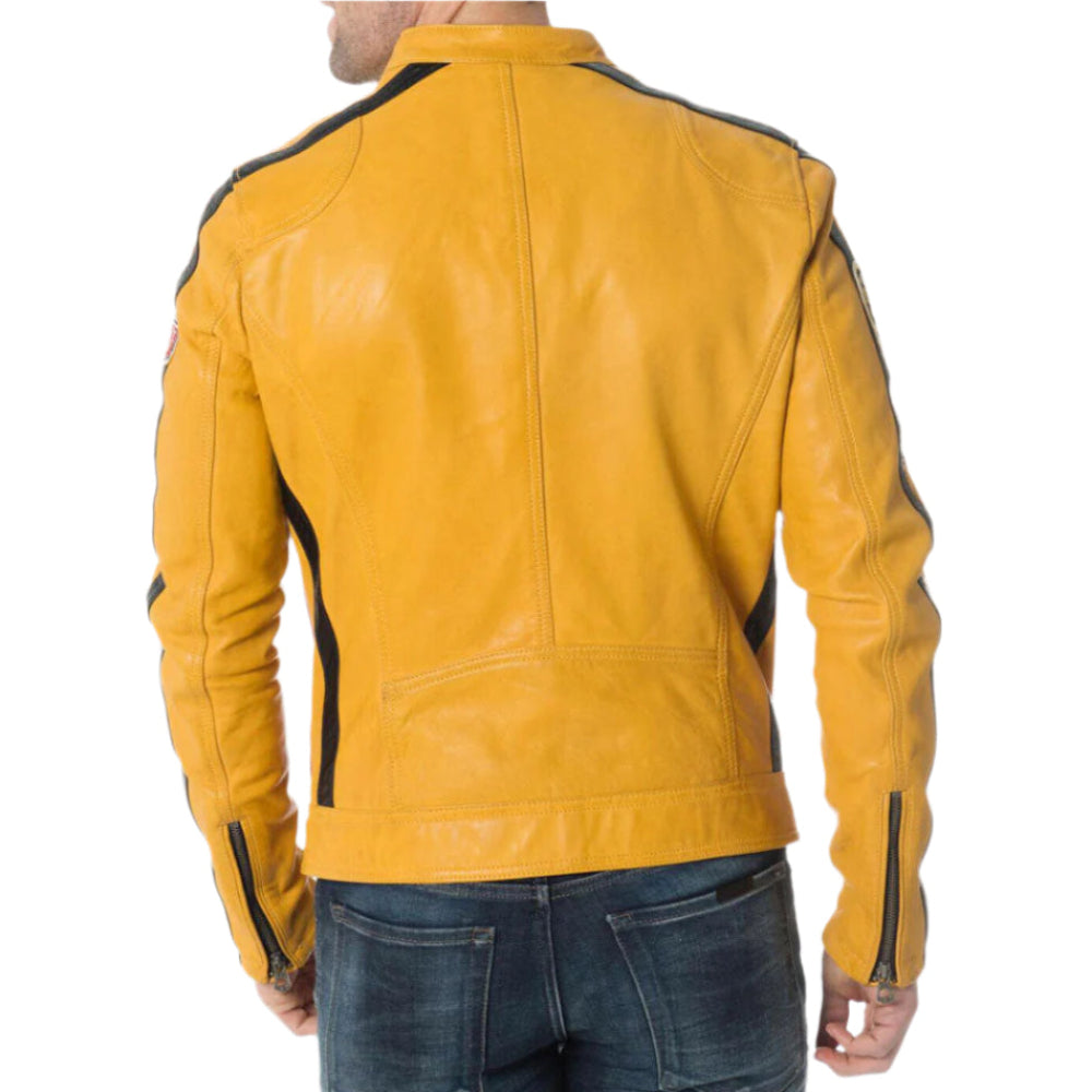 Men’s Yellow Cowhide Leather Biker Jacket – Red & Black Striped Motorcycle Style